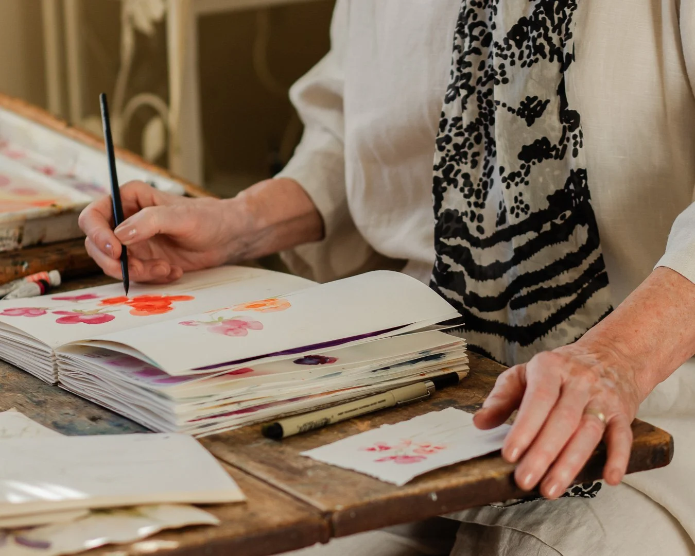 I paint in a loose water-colour style that reflects nature. By using a variety of materials and layers, personal colour combinations emerge and become part of a unique painting or art journal.